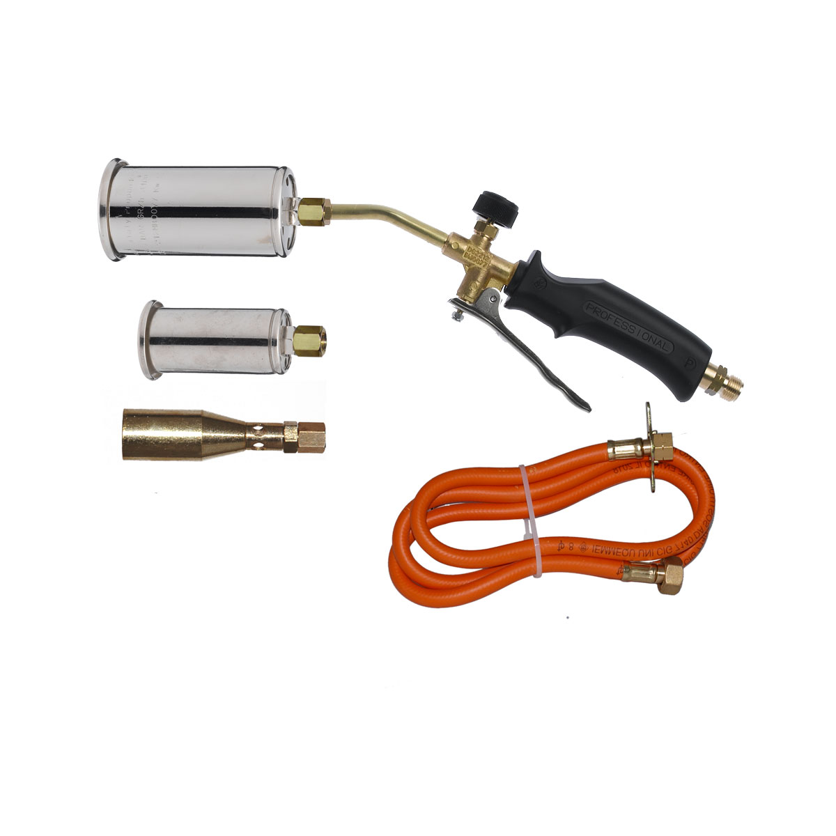 Kit cannello da riscaldo con impugnatura a leva con regolazione di fiamma, bruciatori intercambiabili Ø50, 35, 20mm, completo di tubo gomma 100% NBR da 1,5 mt raccordato.