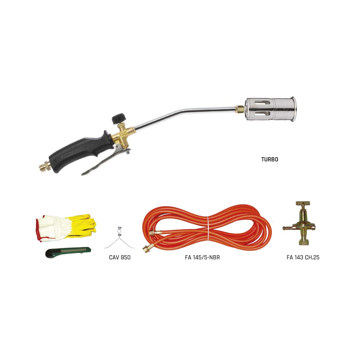 - Cannello con impugnatura a leva, accensione manuale, bruciatore Ø50mm turbo, lunghezza totale 700mm;