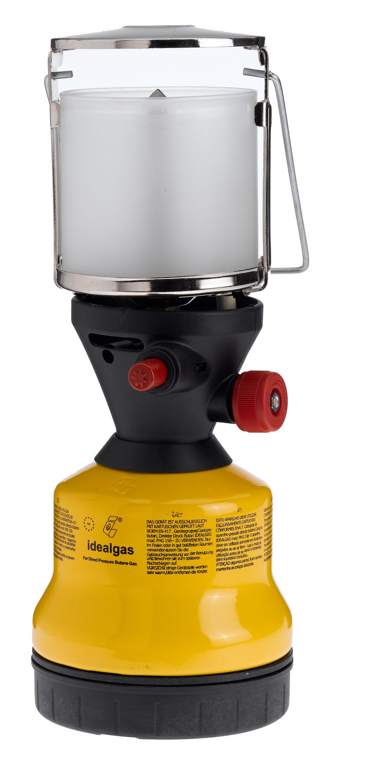 Lampada da campeggio a cartuccia a gas usa e getta da 190gr Butano/ Propano; accensione piezo, corpo in metallo; ugello da 0,15mm; Ø 9cm, H28cm.
